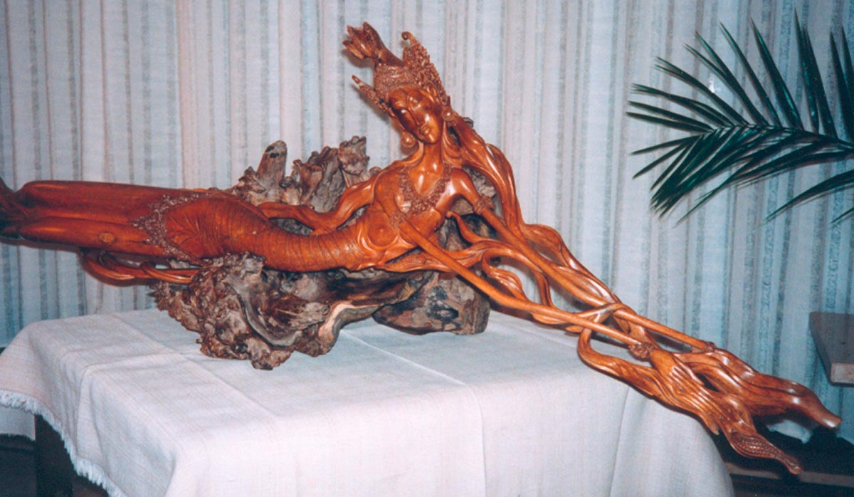 Göttin des Getreides/Reises. Schönes und modernes Stück. Es sind wieder 2 Stücke- unten die Wurzel Hibiskus(Stand) und der Zweig von Hibiskus(Figur). Mit einem schönen Sarong mit Muster