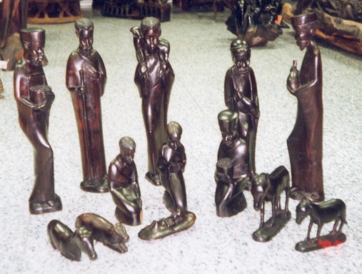Diese Skulptur ist eine 12-teilige Weihnachtskrippe, gefertigt von einem unbekannten Künstler der ethnischen Gruppe der Makonde aus Tansania. Die Krippe besteht aus Ebenholz und umfasst Figuren mit einer Höhe von bis zu 41 cm. Die tiefe, dunkle Farbe des Ebenholzes verleiht der Krippe eine edle und ausdrucksstarke Ausstrahlung.