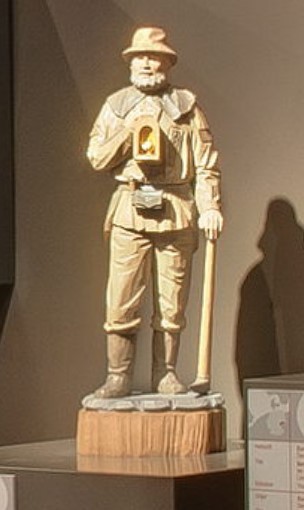 In der rechten Hand hält er eine Bergmannslampe, die früher zur Beleuchtung in den dunklen Stollen verwendet wurde. In der linken Hand stützt er sich auf eine Bergmannskeilhacke, ein typisches Werkzeug des Bergbaus. Die Figur steht auf einem einfachen, stabilen Sockel aus Holz, der an einen Baumstumpf erinnert und die Verbindung zur Natur und zum Bergbau symbolisiert.