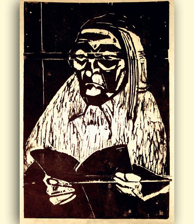 Der Holzschnitt zeigt eine Frau, die in eine große, weite Kleidung gehüllt ist. Ihr Gesicht ist von langen, herabhängenden Haaren und einem Tuch umrahmt, das ihr eine fast mystische Erscheinung verleiht. Die Frau hält eine aufgeschlagene Bibel in ihren Händen. Ihre Hände halten die Bibel zu sich geneigt fest, so dass sie die Bibel gut lesen kann.