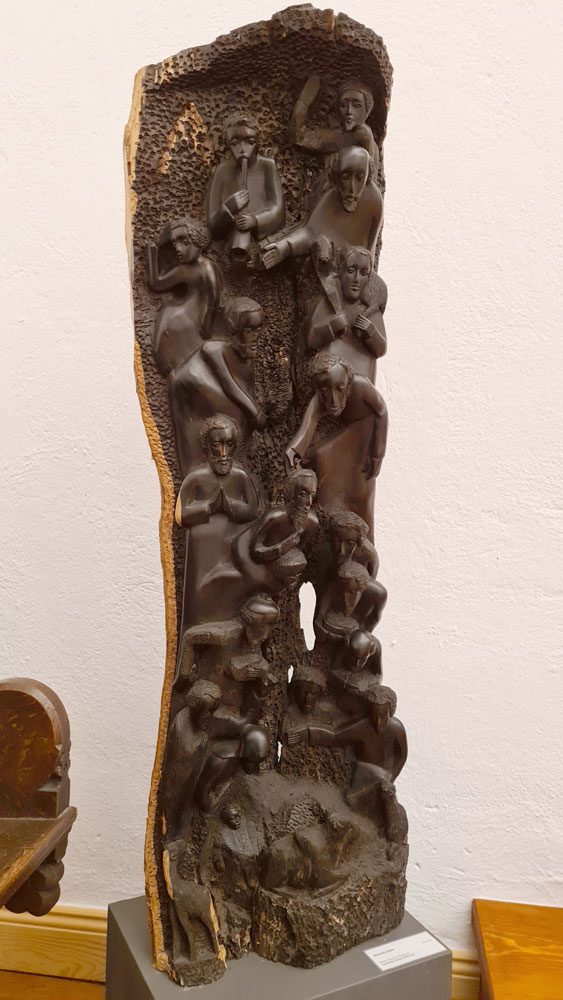 Diese Skulptur ist eine große Standkrippe, die von einem unbekannten Künstler der ethnischen Gruppe der Makonde aus Tansania gefertigt wurde. Sie besteht aus Ebenholz und hat eine Höhe von 120 cm, eine Breite von 38 cm und eine Tiefe von 20 cm. Die Krippe ist künstlerisch besonders wertvoll und zeigt die typische Handwerkskunst der Makonde.