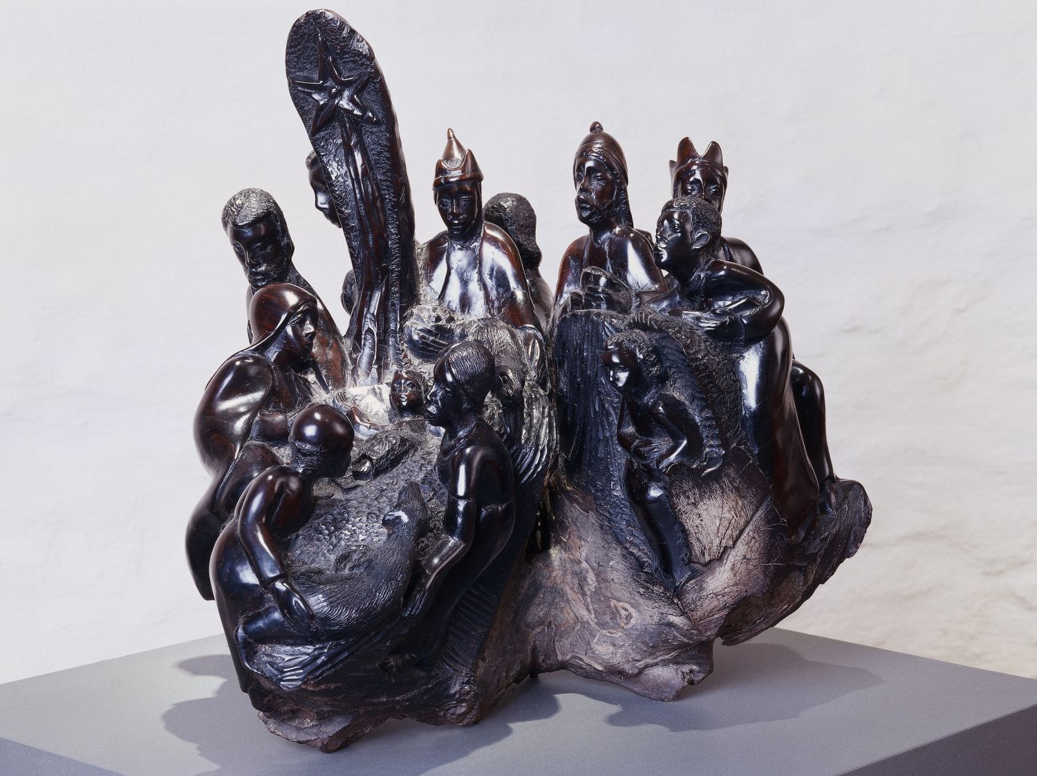Die Krippe zeigt eine kompakte, harmonische Komposition mit mehreren menschlichen Figuren, die eng beieinander in einer natürlichen, organischen Form angeordnet sind. Die Figuren sind dynamisch und ausdrucksstark geschnitzt und bilden die Weihnachtsgeschichte ab.