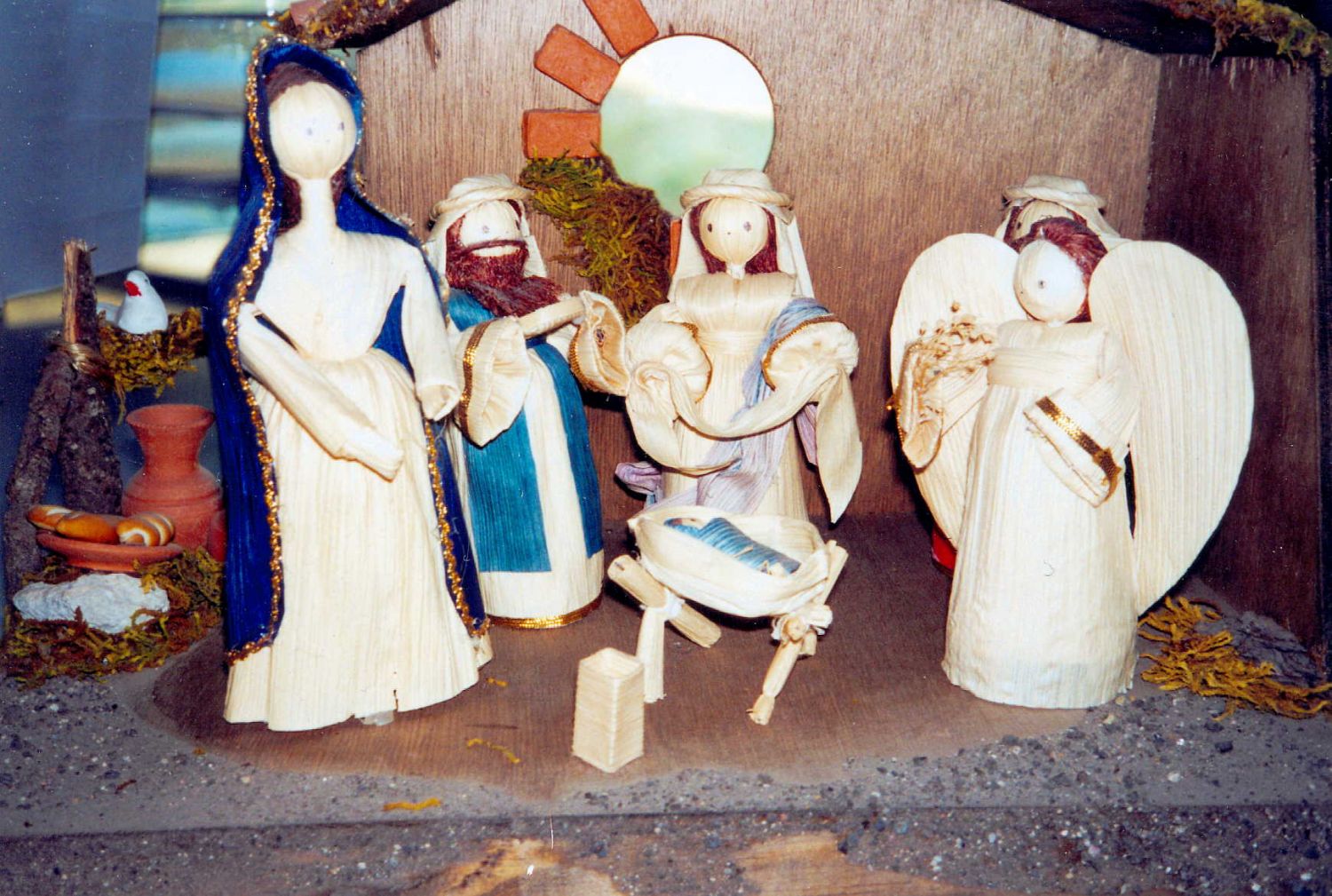 Die Krippe zeigt eine traditionelle Szene der Weihnachtsgeschichte, wobei die Figuren aus getrockneten Maisblättern gefertigt sind, die auf einem Holzgestell oder einer Holzplatte angeordnet sind. Maria ist mit einem blauen Umhang bekleidet und hält das Jesuskind in ihren Armen. Ihr Gesicht ist sanft und liebevoll gestaltet. Josef steht oder kniet neben Maria und trägt ein einfaches Gewand. Er wirkt schützend und bescheiden. Das Jesuskind liegt in einer kleinen Futterkrippe, die ebenfalls aus Maisblättern oder Holz gefertigt ist. Ein Engel mit Flügeln steht da mit Blumen in der rechten Hand. Hirten sind ebenfalls Teil der Szene, einige von ihnen halten Tiere wie Schafe oder spielen auf Flöten. Im Hintergrund sind einfache Accessoires wie Tontöpfe, Stroh und ein Miniatur-Stall zu sehen, die die Szene bereichern. Die Maisblätter sind kunstvoll gefaltet und zu detaillierten Figuren geformt, was der Krippe eine einzigartige und handwerkliche Note verleiht. Die natürliche Farbe der Maisblätter und die einfachen Holzstrukturen schaffen eine warme und besinnliche Atmosphäre.